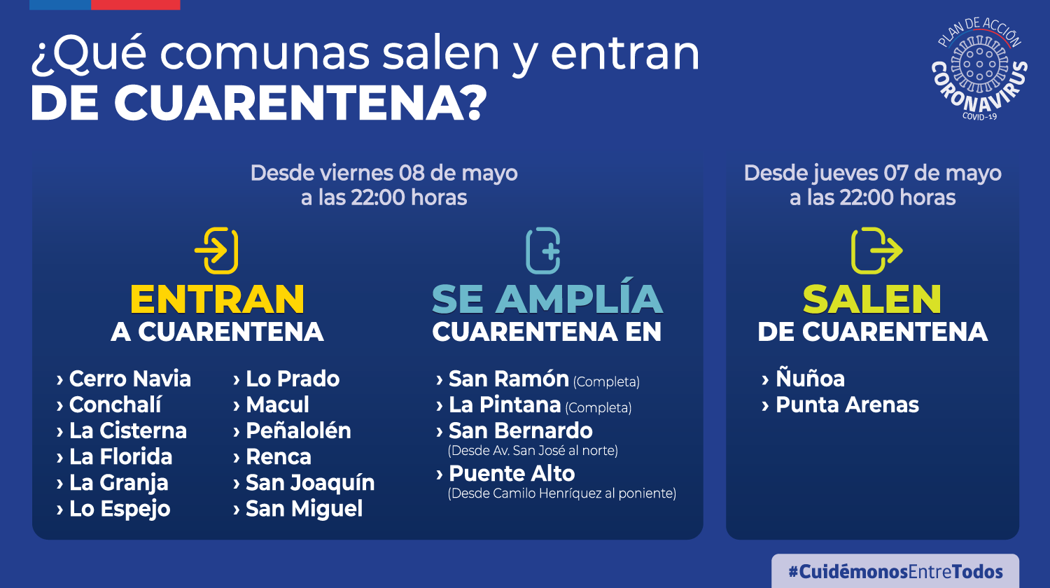 El miércoles 6 de mayo, el ministro de salud, jaime mañalich, informó que la medida de cuarentena se extenderá a 32 comunas del país.